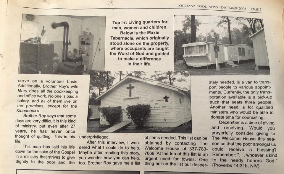After Brother Allen went to be with the Lord, Brother Roy became Pastor of Maxie Tabernacle, but his ministry to the homeless continued to grow. He started out by putting people up in motels until someone in Crowley donated the use of a one-room house. That house was used for about a year, then a house was leased in Rayne for about two years. After that, it was back to Crowley in another leased house for about six months.