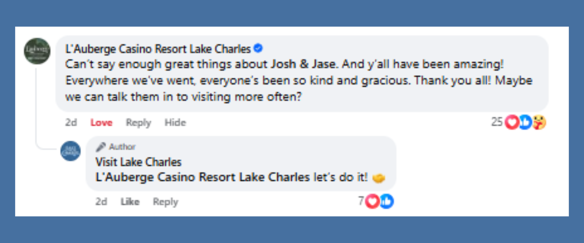 - Commented as Visit Lake Charles to acknowledge their presence, signal local support, and steer sentiment.